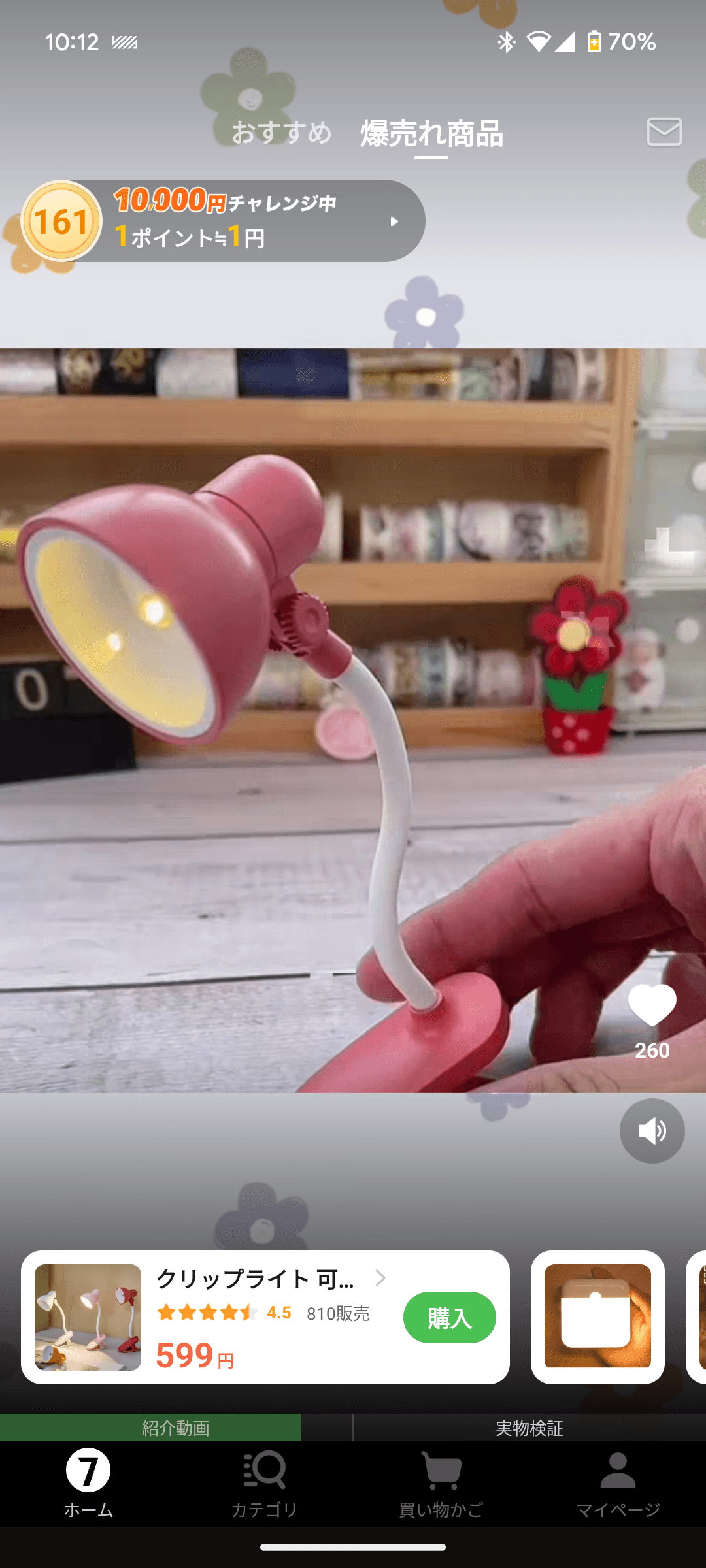 ショート動画を7秒間、観るごとに1ポイントが付与される仕組みになっており、ついつい見てしまいます。1ポイント=1円で購入の際に利用できます。