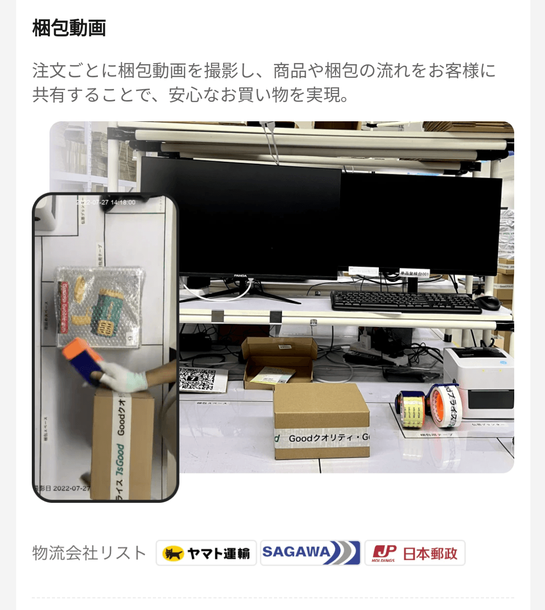 また注文ごとに撮影された梱包動画が、出荷前にアプリに届きます。丁寧で安心な物流をアピールしているようです。