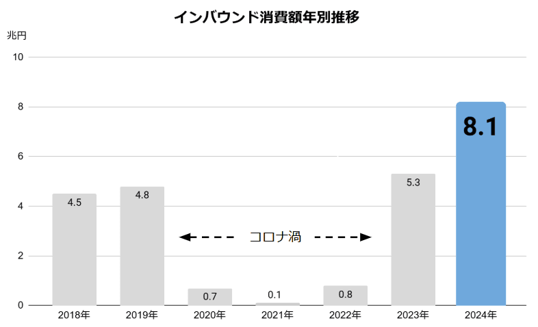 観光庁が好評している最新のデータによると2024年のインバウンド消費額は8兆1395億円でした。コロナ禍以前で最も多かった2019年の4兆8135億円と比較すると、実に3兆3260億(168%)増と驚異的なスピートで伸長しています。