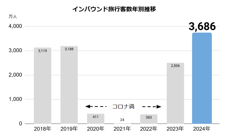 次にインバウンド旅行客の推移を見ていきましょう。下のグラフは2018年から2024年までのインバウンド旅行客の推移を表しています。2024年は過去最高となる3,686万人を記録しました。2018年の3,119万人、2019年の3,188万人とコロナ禍を挟み増加傾向にあります。日本政府はこの数字を2030年までに6,000万人まで引き上げるという目標を掲げており、今後もますますインバウンド旅行客の増加が期待されます。