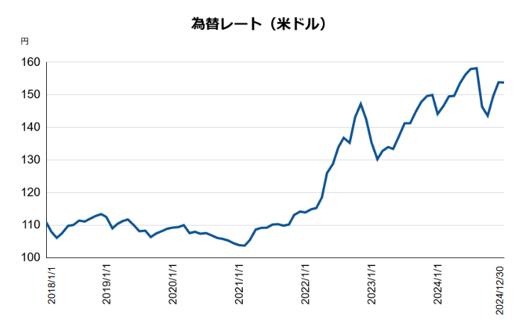 2024年7月に対米ドルの月平均為替レートが1ドル158円を記録するなど、昨今著しい円安傾向にあります。2024年の対米ドル年平均為替レートは1ドル151円でした。このように過去稀に見る円安はインバウンド産業には追い風となっている事でしょう。例えば2019年12月に10,000円する物を購入するにはおよそ91ドルだったものが、5年後の2024年12月にはおよそ65ドルとなり、なんと26ドルも安く買えるなど海外の人達に取って日本のものは信じられないくらい安く買えるようになりました。