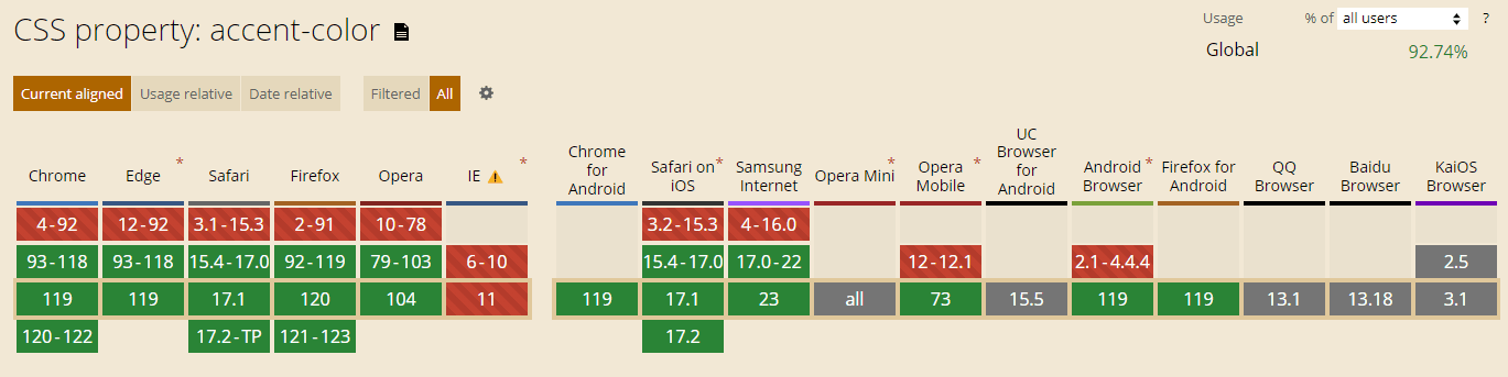 accent-colorプロパティとは、ラウザが提供するデフォルトのフォーム要素(チェックボックスとラジオボタンとか)の背景色を変更することができるものです。ただし、このプロパティを使用すると、フォームの見た目はブラウザによって統一的に管理されるため、その点に注意が必要です。accent-colorは、2023年からすべてのブラウザにサポートされました。