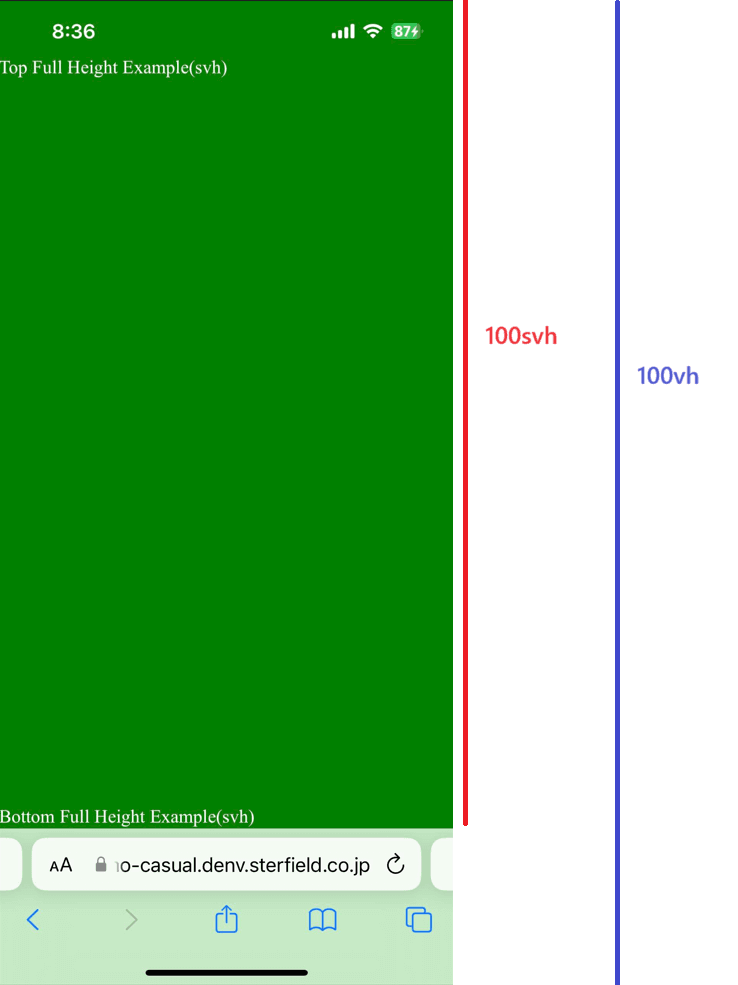 div の 高さを 100vh とすると 下のテキスト(Bottom Full Height Example(svh))が見えなくなります。