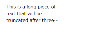 1<p class="truncate-text"> 2 This is a long piece of text that will be truncated after three lines using the -webkit-line-clamp property. This is a long piece of text that will be truncated after three lines using the -webkit-line-clamp property. 3</p>