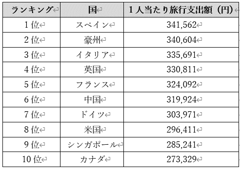 ちなみに1人当たりの旅行支出額が一番多かったのはスペインの34万1千円、次いで豪州34万円、イタリア33万5千円の順となっています。