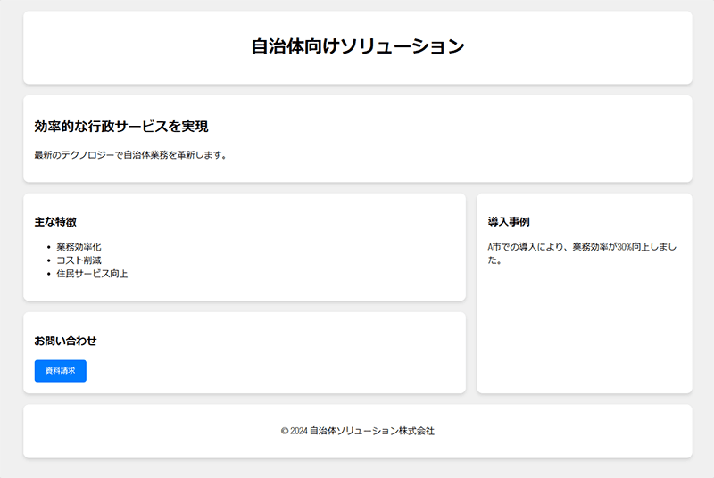 しかし、BENTO UIの一般的な構造に基づいて、自治体向けのランディングページをイメージしたBENTO UIのテンプレートを提案することはできます。以下に、そのためのHTMLとCSSのコードを示します。