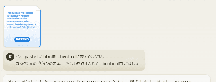 そして、このHTMLファイルをアップロードし、「今 pasteしたHTMLをBENTO UIに変えてください。なるべく元のデザインの要素 色合いを取り入れてBENTO UIにしてほしい」と指示を出しました。
