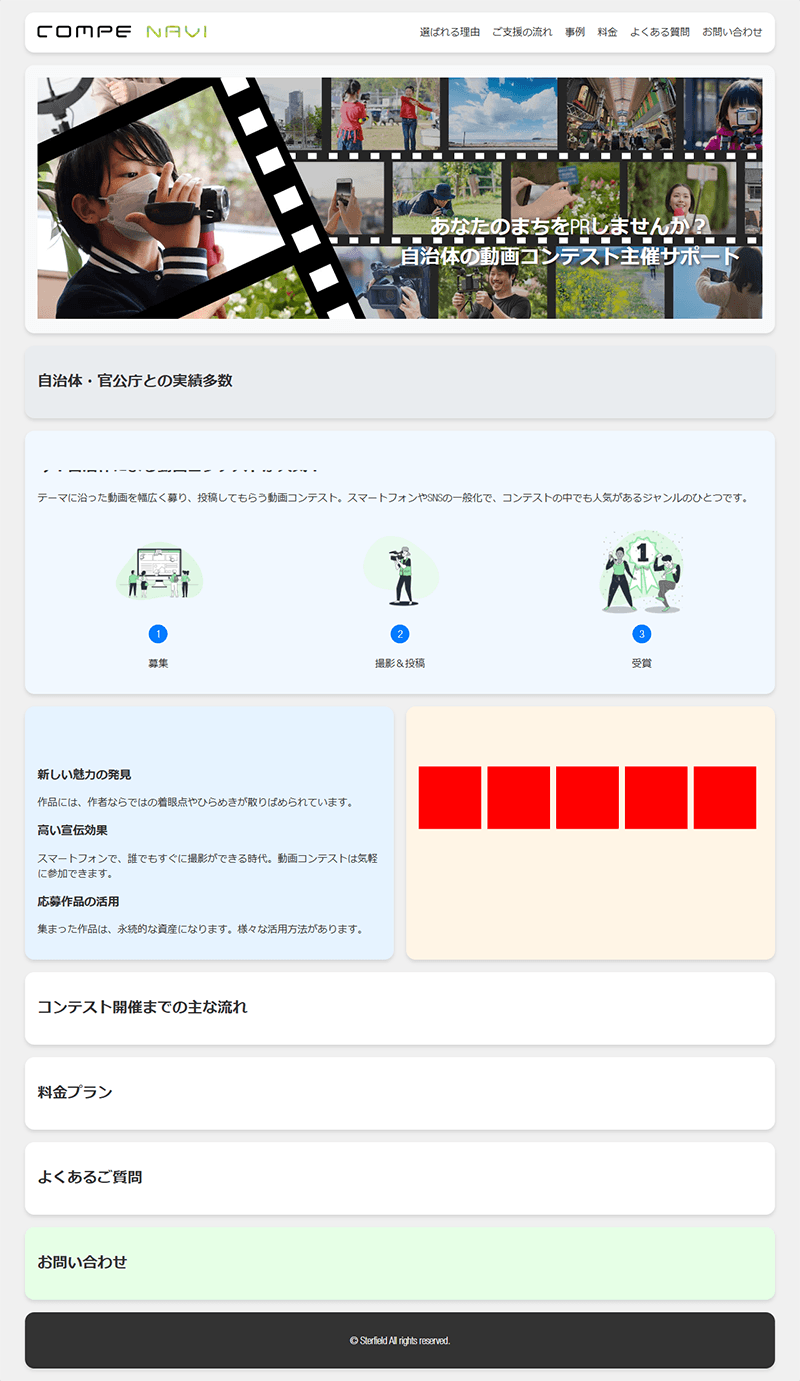 Claude AIの能力を検証するために、弊社で運営するコンペナビのLP「自治体向け動画コンテスト主催サポート」を最近のトレンドであるBENTO UIの形にする実験をしました。