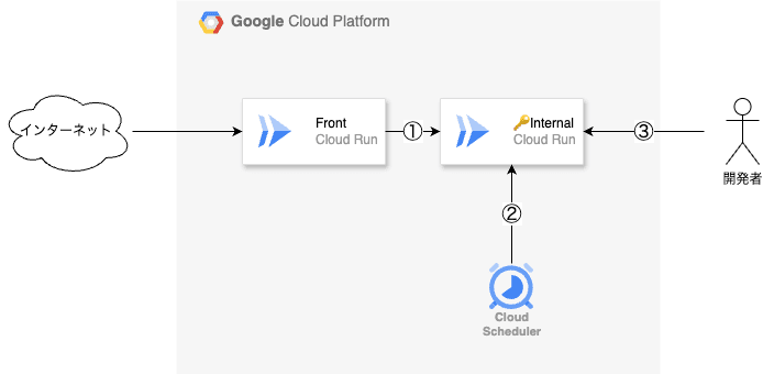 Google Cloud の Cloud Run を使ってインターネット上に公開せず内部からのアクセスのみを受け付けるサービスを構築する場合、いくつかの方法がありますが認証オプションを「認証が必要」にしてデプロイする方法がもっとも簡単です。
