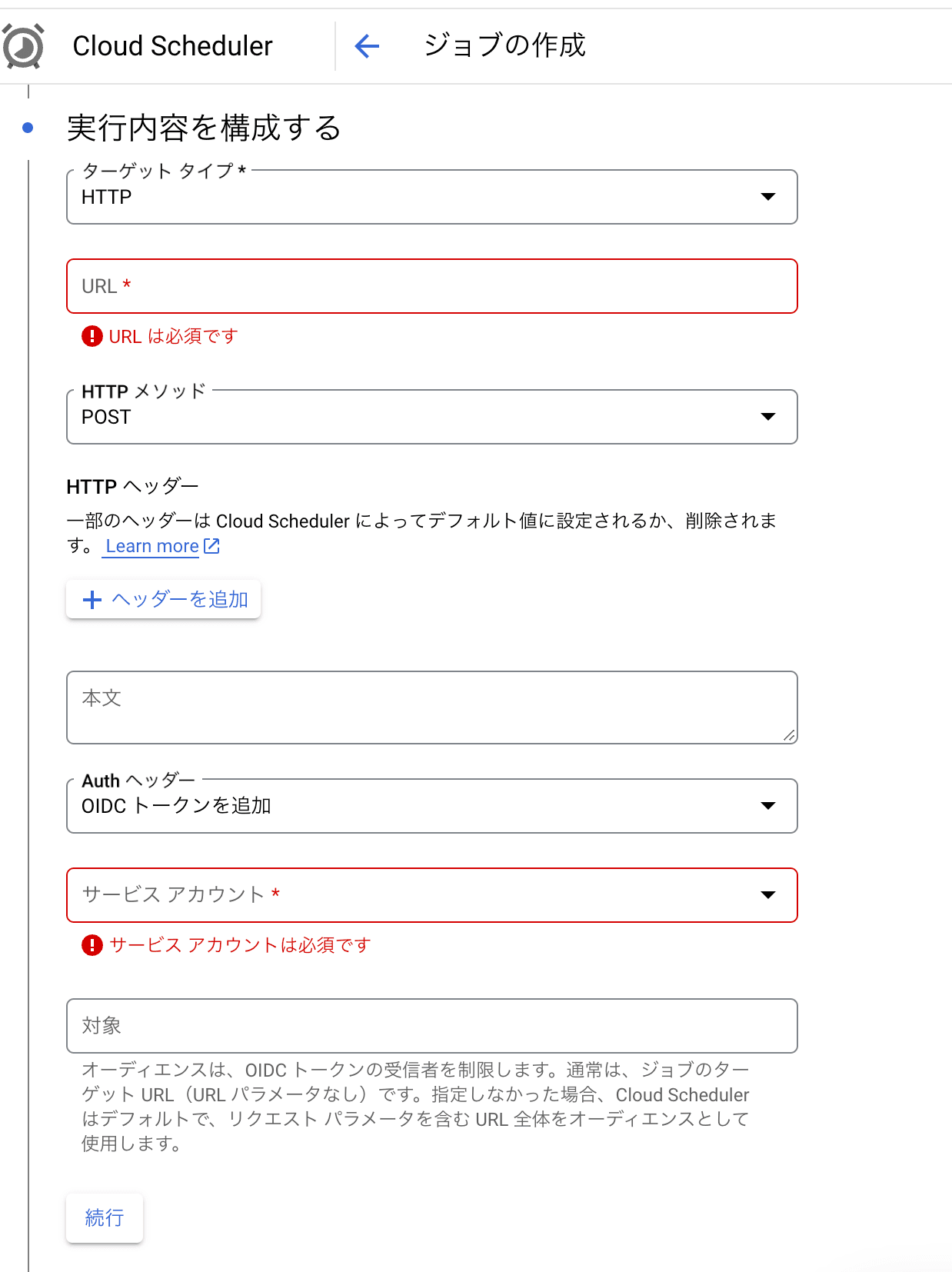 Cloud Schedulerから「Internal」にアクセスする場合は、HTTP ターゲットを作成する際、Auth ヘッダーを「OIDC トークンを追加」に設定してサービスアカウントに