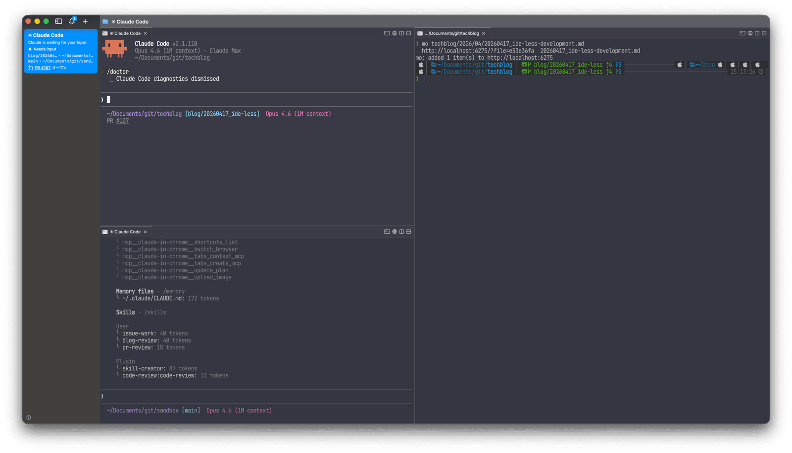 cmuxによる複数セッションの並走、git worktreeを活用したレビュースキルの整備。どちらも派手な話ではありませんが、組み合わせることで「一人で複数のエージェントを指揮する」開発スタイルが現実のものになりました。