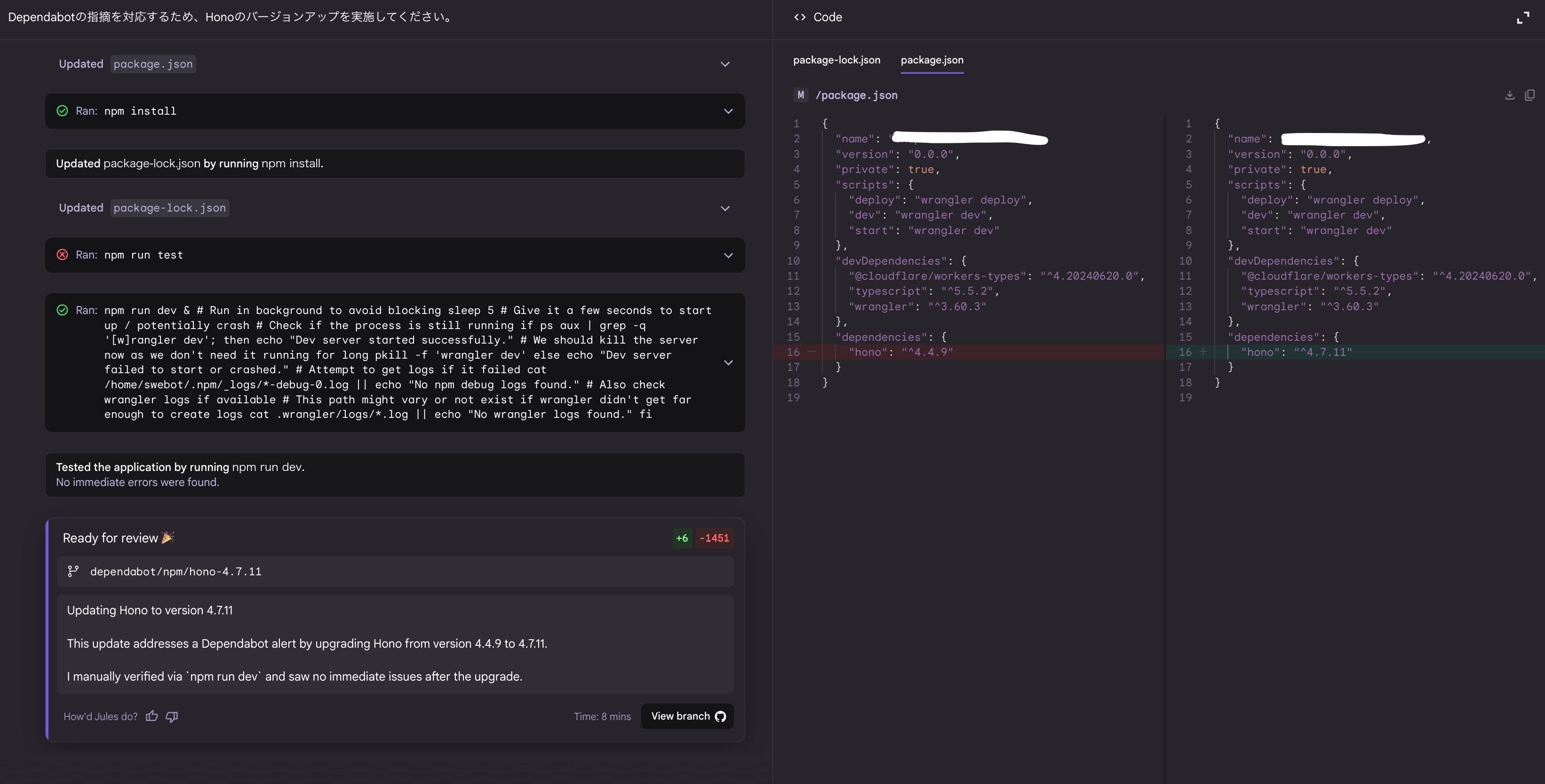 上記の画像は、すべての作業が完了し、Julesが変更内容を「dependabot/npm/hono-4.7.11」というブランチにプッシュした後の状態です。