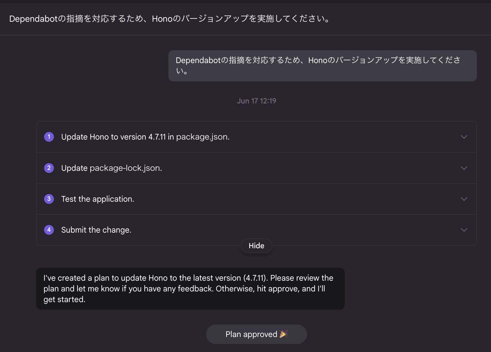 今回は、「Dependabotの指摘に対応するため、Honoのバージョンアップを実施してください。」と日本語で依頼してみました。