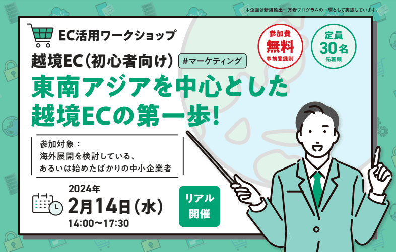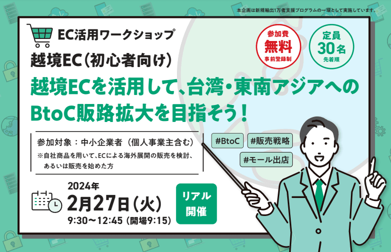 <概要> ・越境ECの重要性と成功のポイント ・自社にとって最適な進出方法を決めてみよう! ・ストアコンセプトを考えてみよう! ・現地人に響く自社商品の見せ方&キーワード ・越境EC出店までのステップ