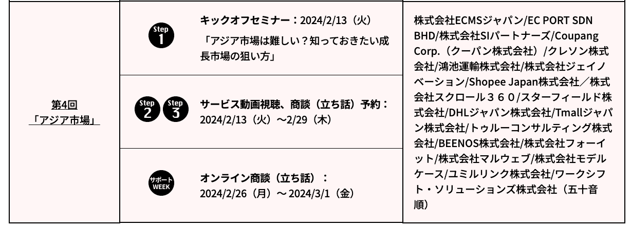 第4回目は、アジア市場ということで、下記のようなアジア越境ECの支援をしている支援業者が多く登場します。