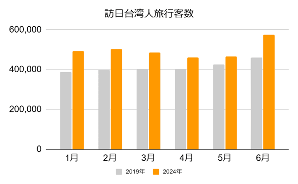 ここでは実際にどのくらいの台湾人が日本を訪れているか2024年1〜6月とコロナ前の2019年1〜6月を比較していきます。2024年1~6月に日本を訪れた台湾人旅行客はいずれの月も2019年を上回り、半年間で約297万人もの方々が日本を訪れました。なんと台湾の全人口(約2,360万人)の約13%(およそ8人に1人)が日本を訪れていることになります。