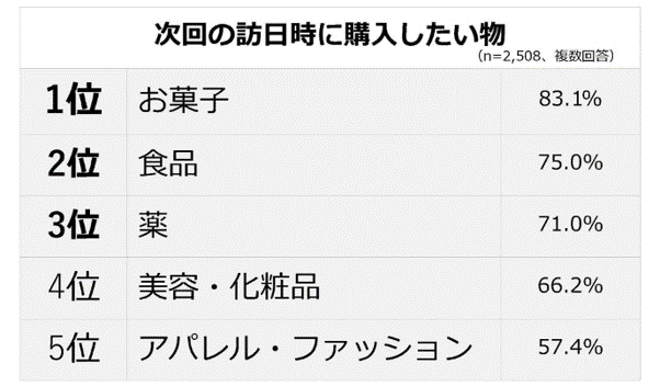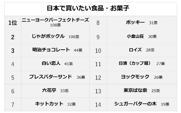 また日本で買いたい食品・お菓子の調査結果では1位「ニューヨークパーフェクトチーズ」、2位「じゃがポックル」、3位「明治チョコレート」と日本人にも馴染みのある人気スイーツがランクインする結果となりました。